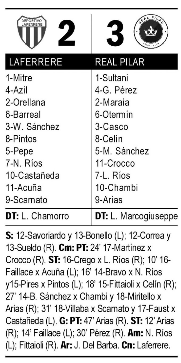 El Rey está en la final. Real Pilar dependía de sí mismo para jugar el gran partido decisivo ante Cañuelas, por un ascenso a la Primera B. Para cumplir con el primer objetivo tenía que ganarle a Laferrere como visitante, y lo hizo. Fue 3 a 2, con un doblete de Javier Arias y Gerardo Pérez para ganar la Zona Campeonato de la C.