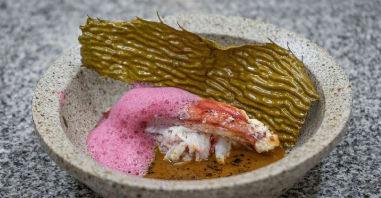 El plato que eligió para representar su proyecto fue centolla del Fuego, gazpacho de zanahorias, ajo negro, kale y cassis, maridado con Baron B Extra Brut.